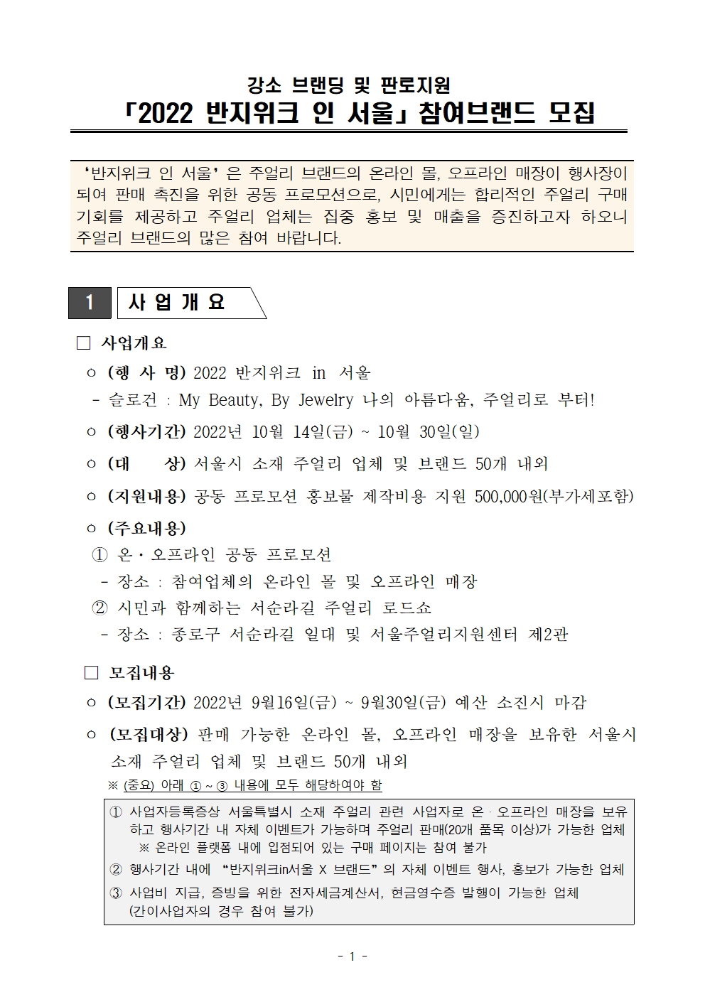 2022 반지위크 인 서울은 주얼리 브랜드의 온라인 몰, 오프라인 매장이 행사장이되여 판매 촉진을 위한 공동 프로모션으로, 시민에게는 합리적인 주얼리 구매기회를 제공하고 주얼리 업체는 집중 홍보 및 매출을 증진하고자 하오니 주얼리 브랜드의 많은 참여 바랍니다.