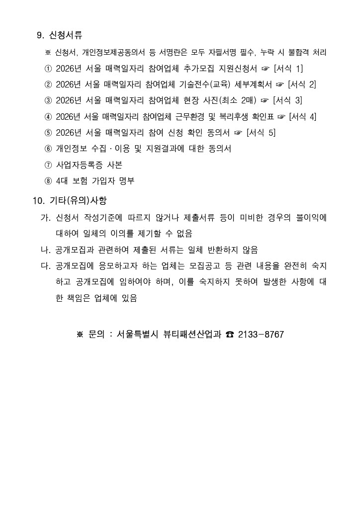 - 제목 : (업체명) 2026년 서울 매력일자리 사업 참여업체 신청(분야)