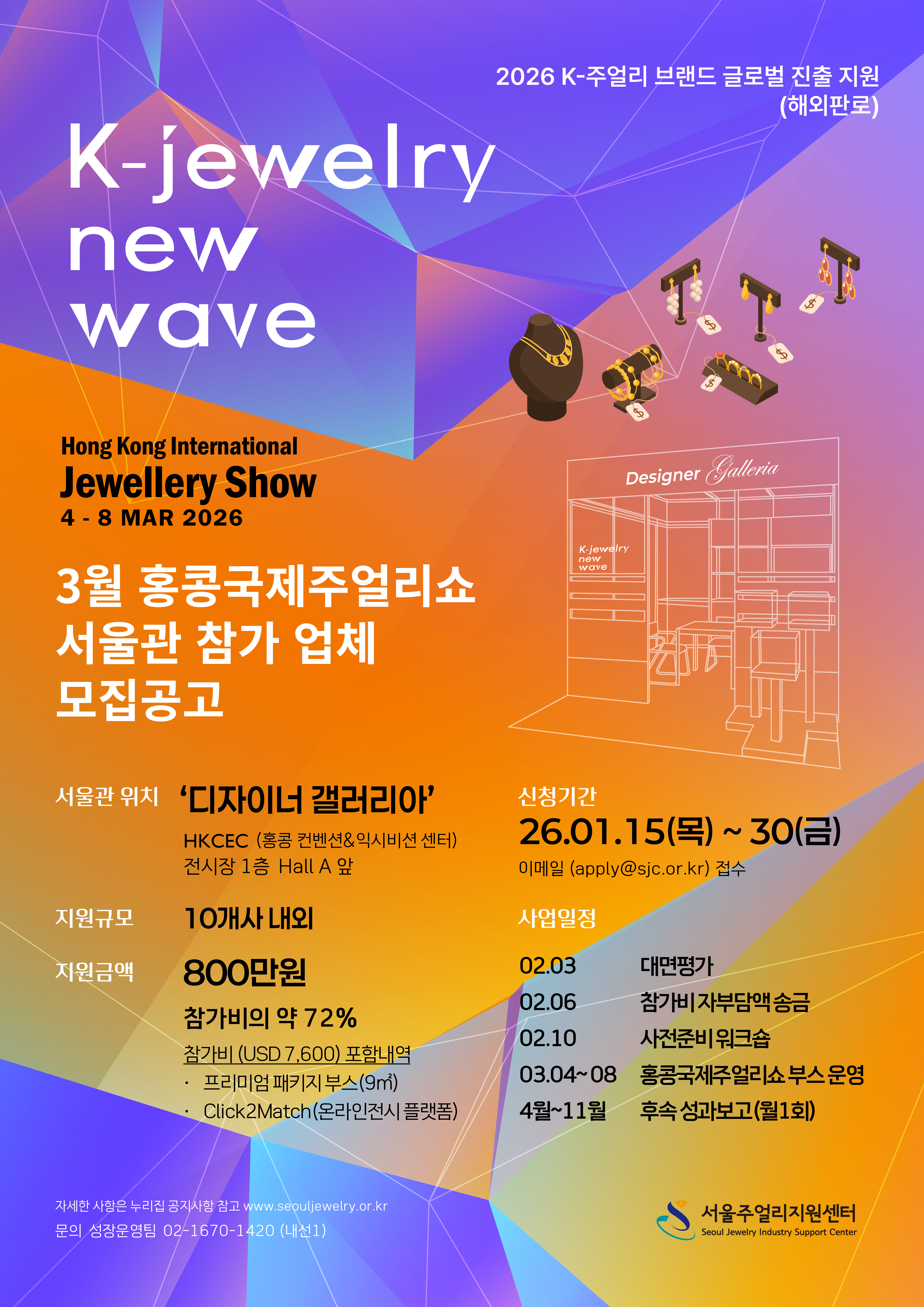 [공고] 2026 K-주얼리 브랜드 글로벌 진출 지원(해외판로) - 3월 홍콩 국제 주얼리 쇼 ‘서울관' 참가 업체 모집