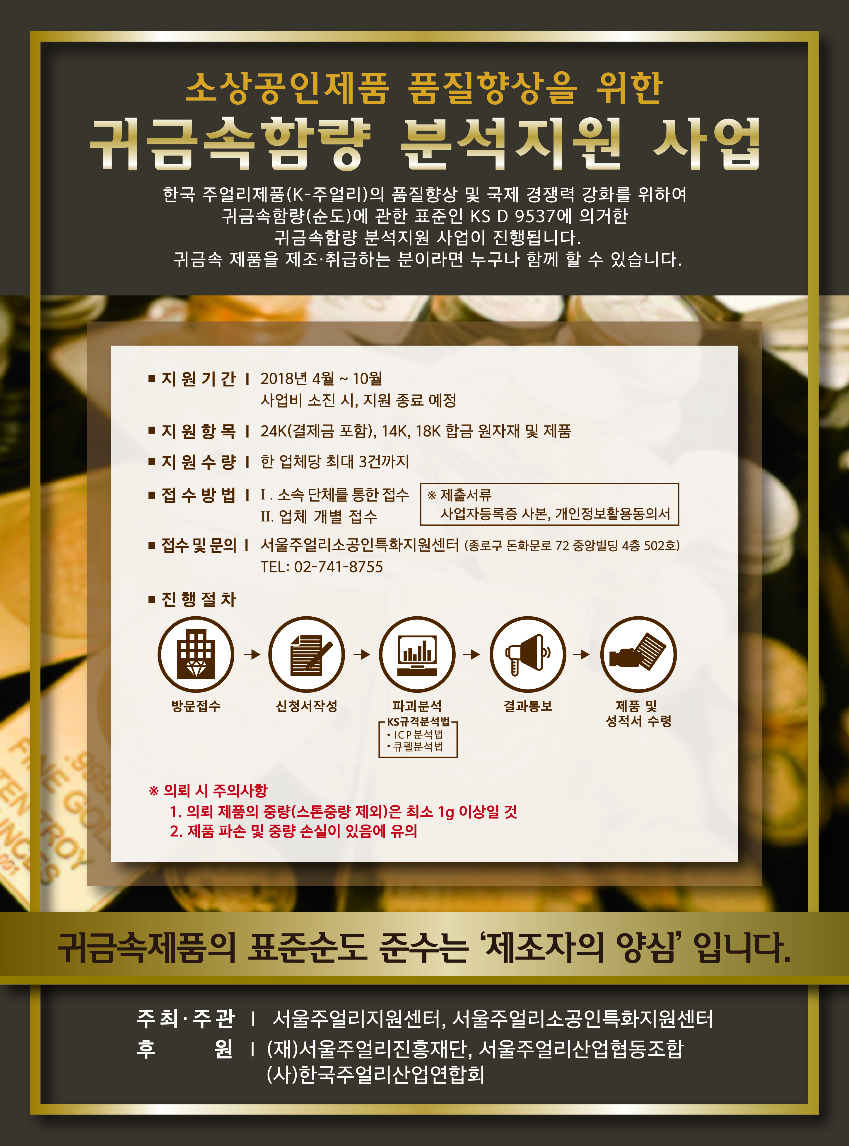 본 사업은 귀금속을 취급하시는 소상공인 제품들의 품질향상을 도모하여 K-주얼리의 국제 경쟁력 강화에 목적이 있습니다.