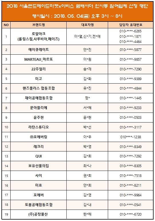 2018 서울핸드메이드마켓x이비스 앰배서더 인사동 참여업체 명단