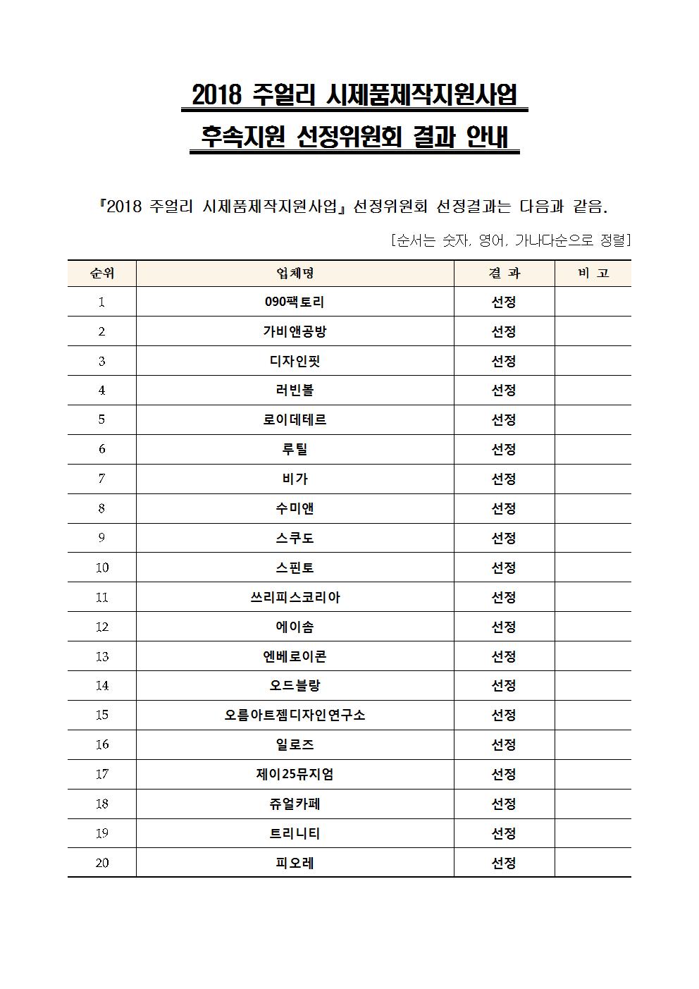 2018 시제품제작지원사업 후속지원(홍보물 제작, 저작권 지원)에 대한 선정결과를 안내드립니다.