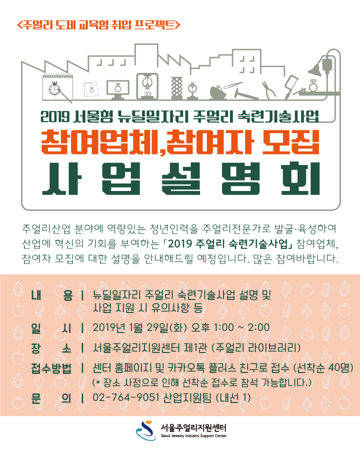 2019 서울형 뉴딜일자리 주얼리 숙련기술사업 참여업체, 참여자 모집 사업설명회를 아래와 같이 개최하오니