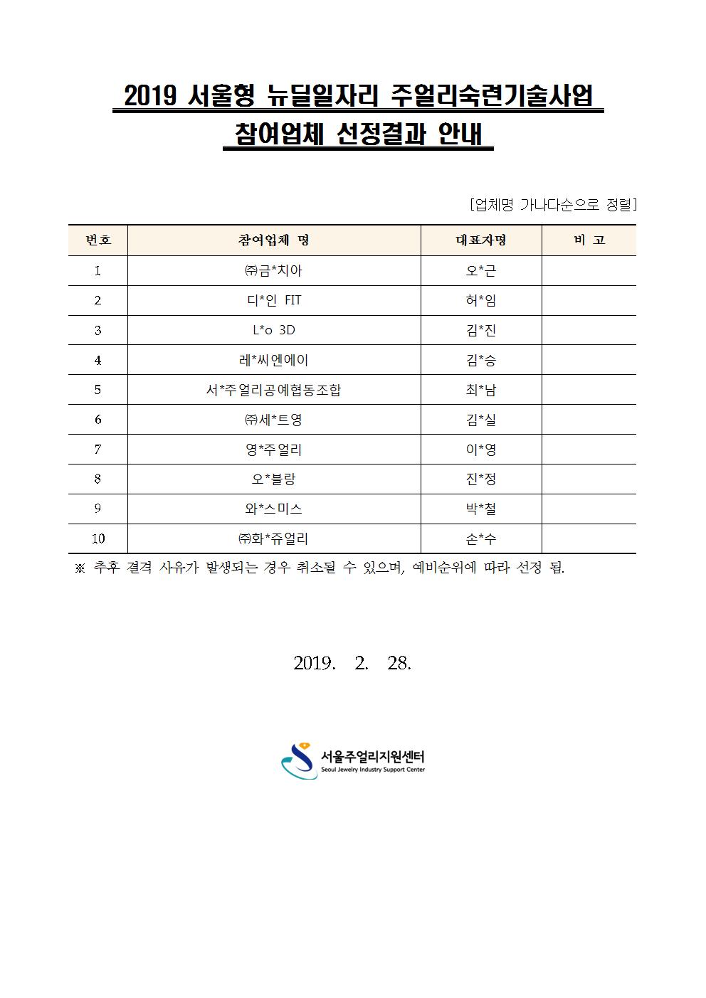 2019 서울형 뉴딜일자리 주얼리 숙련기술사업 참여업체 선정결과를 아래와 같이 안내드립니다.