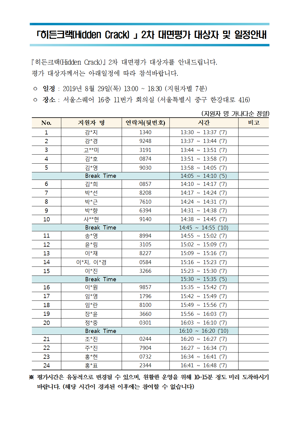 히든크랙(Hidden Crack) 2차 대면평가 대상자 및 일정 안내
