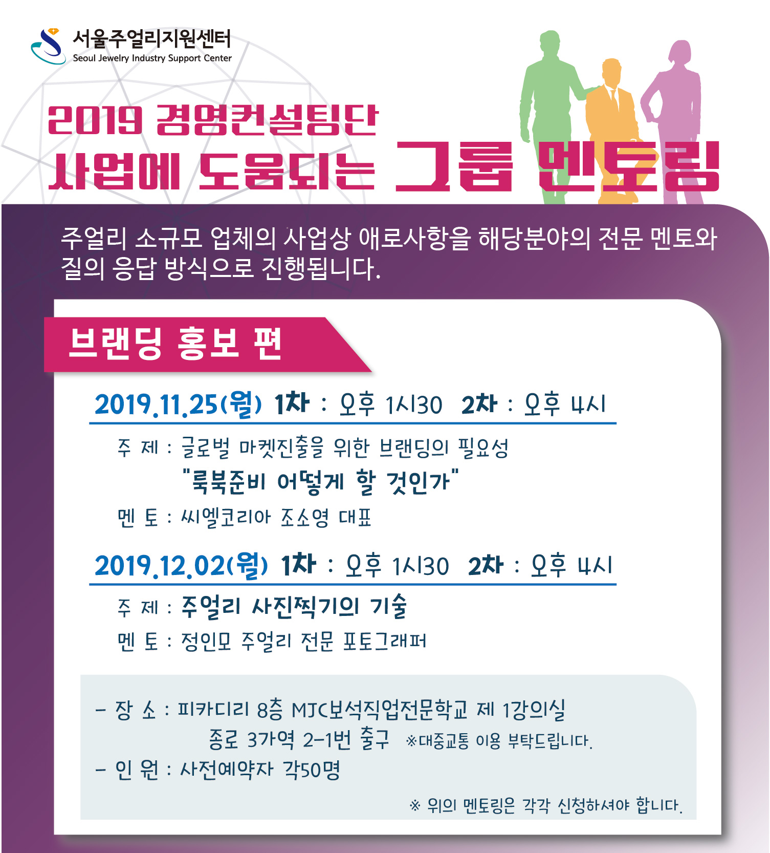 신청하신 분들을 모시고자 장소를 MJC보석직업전문학교(피카디리플러스 8층, 종로3가역 2-1번출구)로 변경하여 총2회(1차 13:30-3:30, 2차 4:00-6:00)로 확대운영합니다.