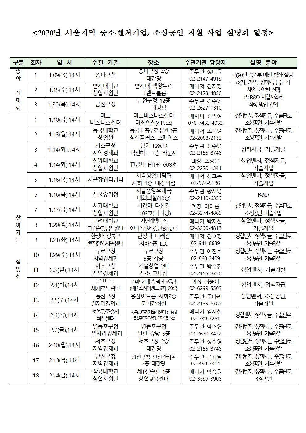 2020년 서울지역 중소벤처기업 소상공인 지원사업 설명회 안내