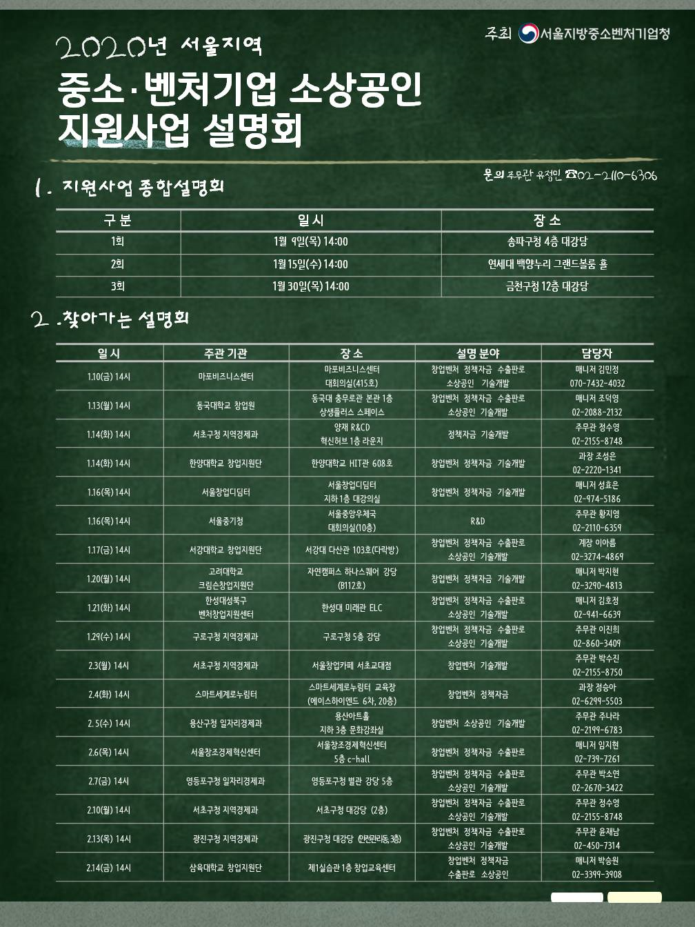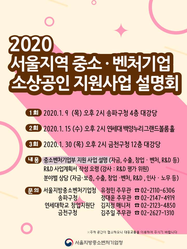 서울지방중소벤처기업청에서 안내되는 2020년 서울지역 중소벤처기업 소상공인 지원사업 설명회를 공유드립니다.