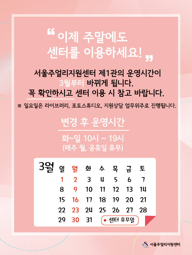 2020년 3월부터 센터를 주말에도 이용할 수 있도록 운영 시간이 변경됩니다.