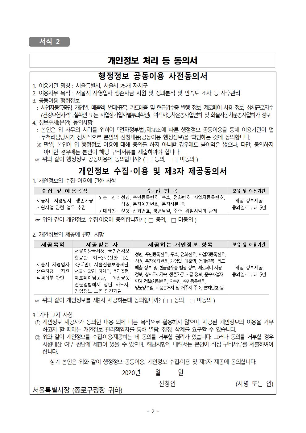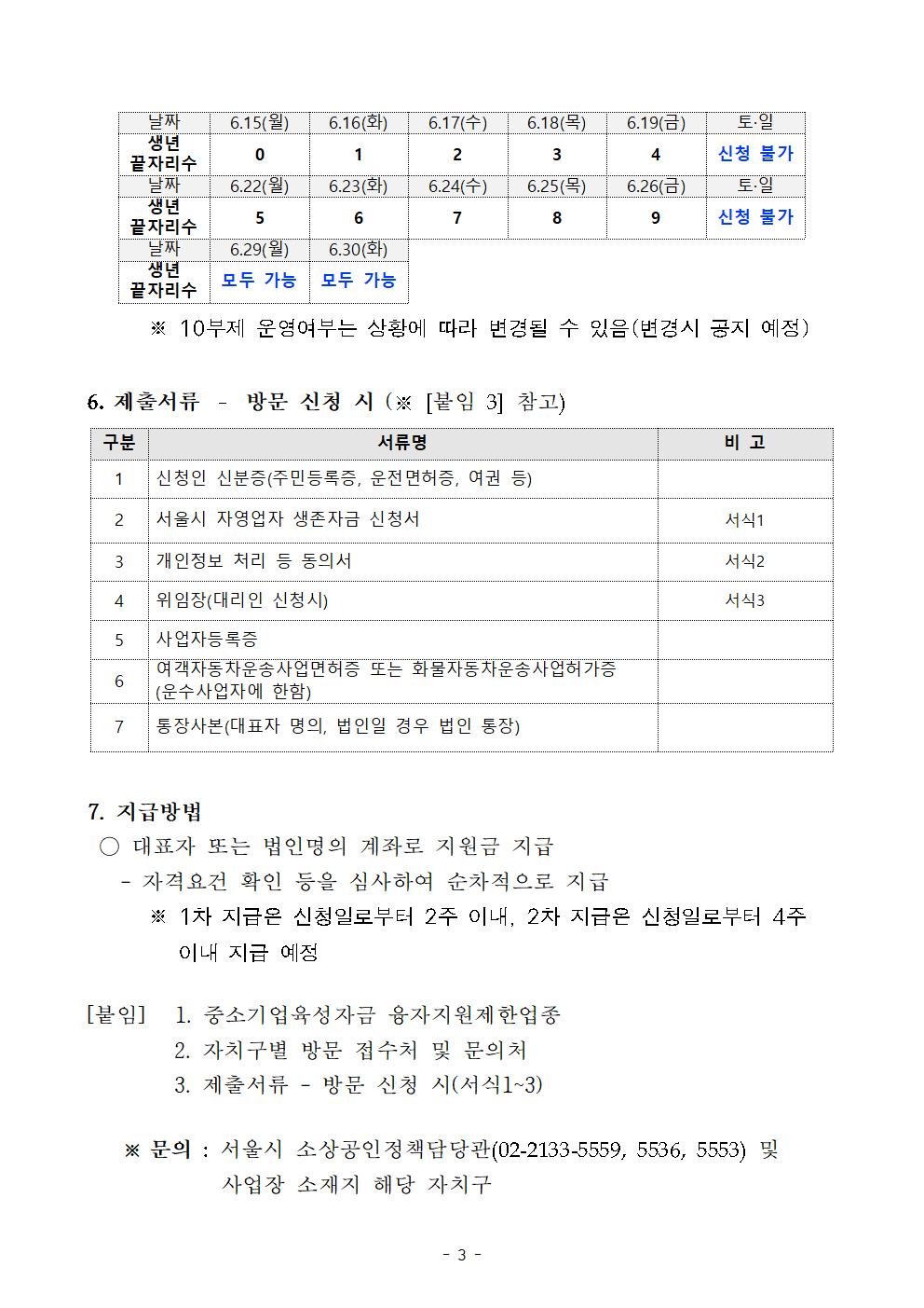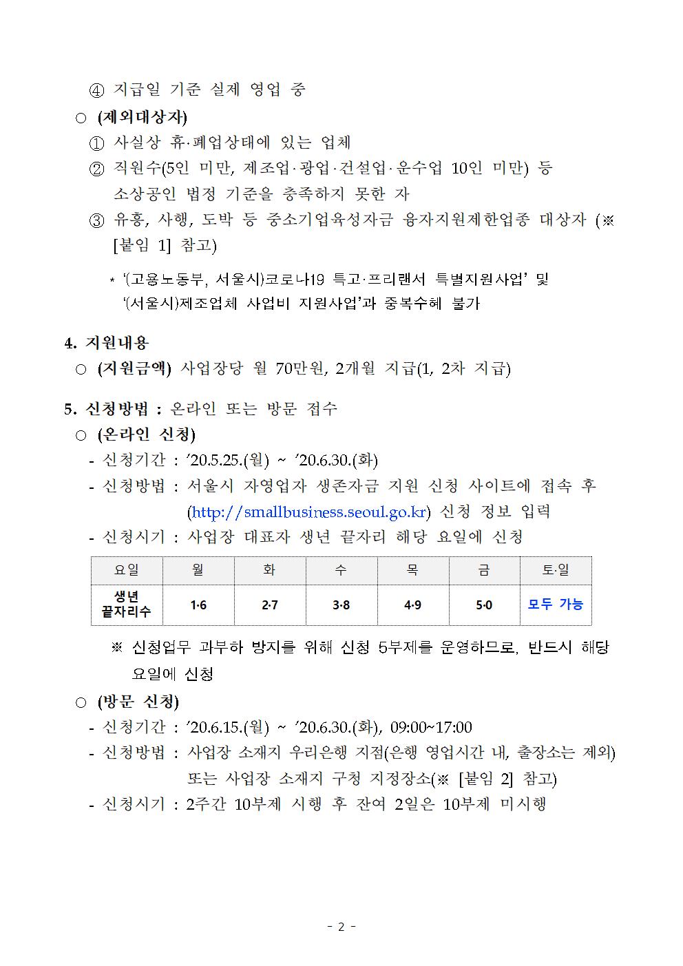 ※ 문의 : 서울시 소상공인정책담당관(02-2133-5559, 5536, 5553) 및 사업장 소재지 해당 자치구
