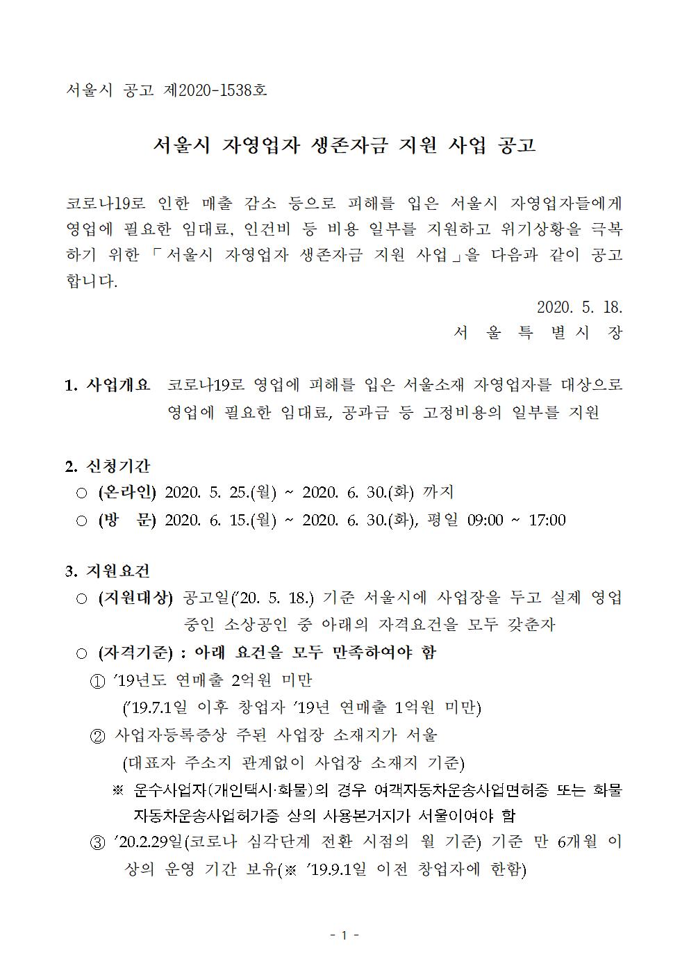 서울시 공고 제2020-1538호 「서울시 자영업자 생존자금 지원사업 공고」에 대해 안내 드립니다.