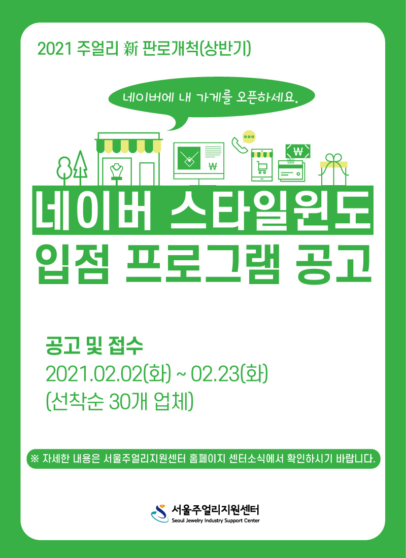 2021 新 판로개척 네이버 스타일윈도 입점 프로그램에 참여할 업체를 모집하오니 많은 신청 바랍니다.