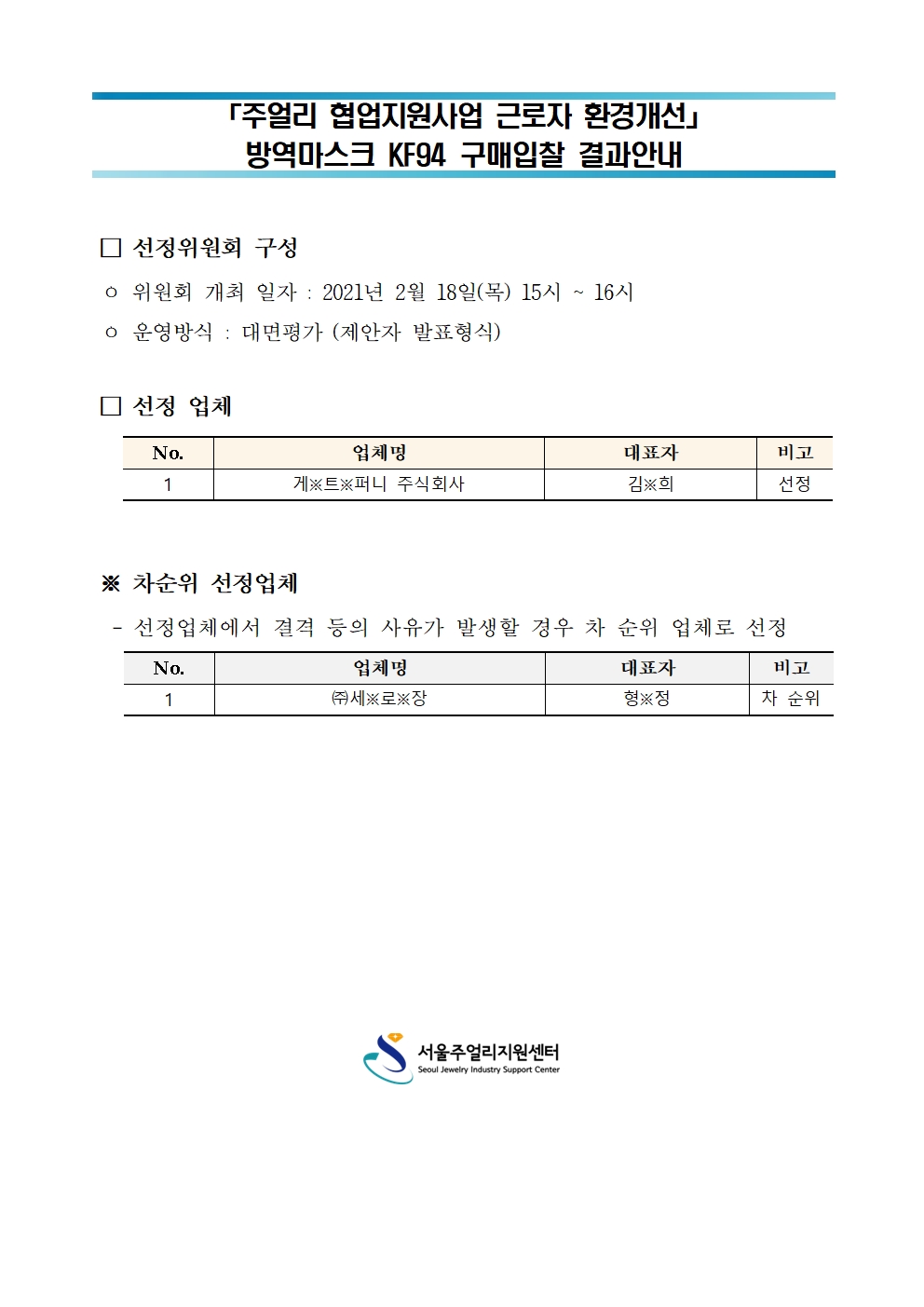 주얼리 협업지원사업 근로자환경개선 분야 「방진마스크 KF94」 입찰결과 안내