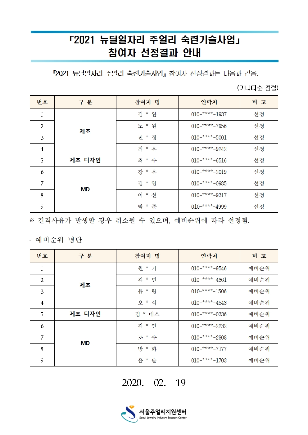 2021 서울형 뉴딜일자리 주얼리 숙련기술사업 참여자 선정결과를 아래와 같이 안내드립니다.