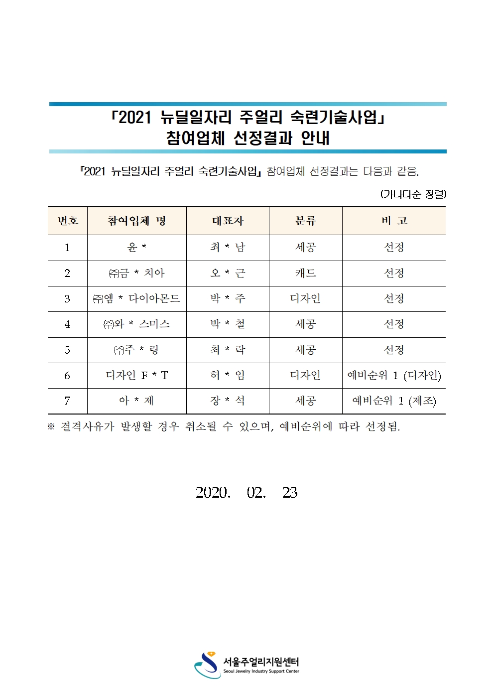 2021 서울형 뉴딜일자리 주얼리 숙련기술사업 참여업체 선정결과를 아래와 같이 안내드립니다.