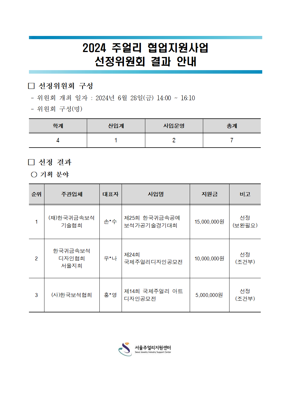 2024 주얼리 협업지원사업 선정위원회 결과를 아래와 같이 안내드립니다.