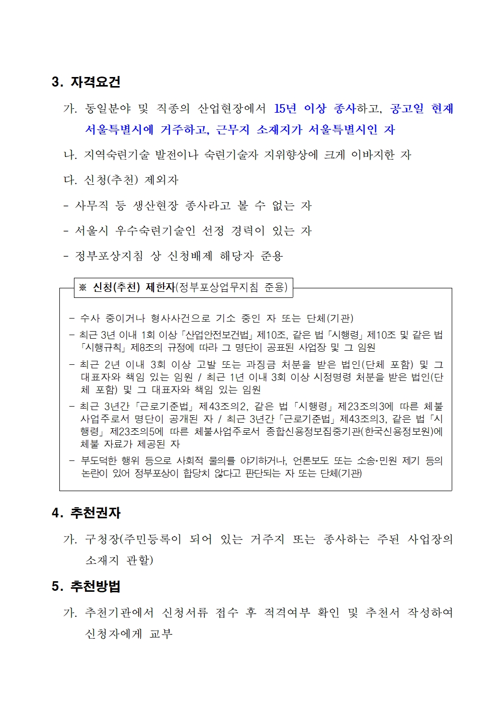 라. 자격요건 : 동일분야 및 직종의 산업현장에서 15년 이상 종사하고, 공고일 현재 서울특별시에 거주하고, 근무지 소재지가 서울특별시인 자 ※ 세부 자격요건은 붙임1 공고문 참조
